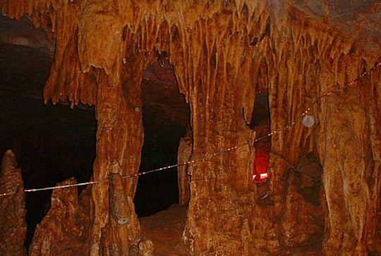 | 藏君洞為一大型天然溶洞,溶洞長25000米,已探明洞長4000m,洞內洞中有洞、洞中有河,迂回曲折,地下河流水潺潺,溶洞分布在石炭系中、上統(tǒng)碳酸鹽巖中,洞內鐘乳石十分豐富:石筍、石柱、石幔、石樓、石像比比皆是。洞內構造奇特,石鐘乳千姿百態(tài)、絢麗多彩,景觀奇秀,珍品奇絕,是我國少有的大型碳酸鹽巖巖溶洞穴之一。目前已開發(fā)的4000m洞穴中,由十二個大的溶洞群構成,由洞口往里有護君堂、惠帝殿、兩重天、南巡廳、不夜城、龍鳳宮、北國廳、江南廳、江河壩、閱兵場、國寶廳等溶洞景觀區(qū)。溶洞一般高5~30m,長60~100m,寬10~20m,面積60~200㎡。十二個溶洞沿地下河呈串球狀分布,洞與洞之間有巷道(地下河管道)相連,溶洞中景觀十分豐富,仿佛是一個瑰麗的地下宮殿。如護君堂內有“尚書帽”、“御馬”、“貓頭鷹”、“小羊羔”、“老夫妻”、“天宮浴盆”等景點,惠帝殿內由“斷劍石”、“龍椅”、“觀音立佛”、“觀音蓮花寶座”等,“蔬果長廊”中有形似花菜、白菜、絲瓜、茄子、黃瓜等石筍,不夜城內有乳白色石鐘乳巖溶坡面,龍鳳宮內有石幔、石柱琳瑯滿目及鐘乳石構成的似漢白玉“龍鳳石床”、“旭日東升”的浮雕石鐘乳墻、“燈籠群”、“攀龍柱”、“石蓮花”等,國寶廳巨型石柱等,巷道側壁唐僧師徒“西天取經”壁畫等,景觀類型齊全,是巖溶洞穴中具有典型地學意義的巖溶地貌景觀,屬國家級的地質遺跡景觀。