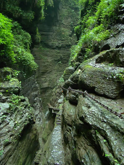 坐龍峽風(fēng)景區(qū) 坐龍峽擁有中國(guó)第一條特種游道。所有游道均建于峽谷深處,依山取勢(shì),既經(jīng)細(xì)心雕琢聽卻又渾然天成。粗樸的板栗木棧道,可以讓你零距離的親近那一潭碧幽、聽聞山泉叮咚;精巧的跳墩,可以讓你媳戲流泉、觸感溪瀑;原質(zhì)的石坎道,讓你不得不調(diào)動(dòng)全部的身心能量悉心攀援、感悟峽谷;有驚無險(xiǎn)的鐵梯,讓你伴著腳下轟鳴的溪水,在驚怵中體味一份快慰。出口處的土家山寨,保留了古樸獨(dú)特的生活習(xí)俗。一塊臘肉就一口醇香的“苞谷燒”會(huì)讓你洗去所有的疲憊,在輕松中憨厚的主人向你講述過去強(qiáng)人出沒的故事......