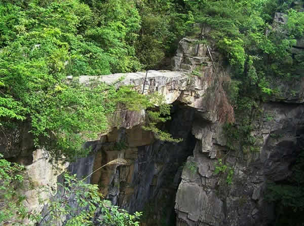 仙人橋又稱天下第一橋,坐落在猴子坡上、天子峰下的王爺洞對(duì)面。橋?qū)僮匀恍纬,長(zhǎng)26米,寬1.5米,厚一米多,高約六七十 米,飛架在兩岸懸崖絕壁之上,鬼斧神工,惟妙惟肖,古人云:“天地可掬,此真天造也”。仙人橋?yàn)榧t砂巖結(jié)構(gòu),兩端生有高大的黃山松和杜鵑樹,濃蔭掩映,極其美麗。橋的東頭還有自然形成的石級(jí),人可順石級(jí)而下,走上天橋,下視萬(wàn)丈深淵,令人頭暈?zāi)垦,非健壯者不敢逾越,旅游者無(wú)不贊嘆,說(shuō)它是“天下絕景”。
