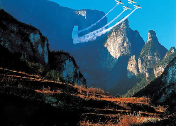 天門洞風光圖片 天門洞景觀 1700多年來,這一道奇絕天下的勝景吸引著無數(shù)的探訪者趨之若鶩。特別是在1999年,世界特技飛行大師駕機穿越天門洞,在全球引發(fā)了轟動效應(yīng),收看現(xiàn)場直播的觀眾達到8億之多。