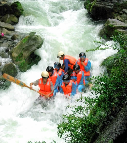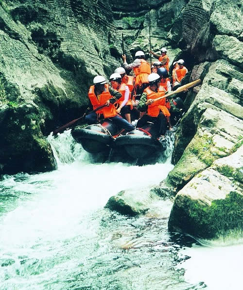 西門峽 西門峽漂流全程6公里,屬萬溶江流域,它發(fā)源于兩頭羊自然保護區(qū)的群山之中;沿途危崖夾峙,樹木蔥榮,水質清澈、急流、險灘星落棋布。共有虎跳澗、白龍灘、臥龍灘、青龍峽、鬼見愁、龍王灘等急流險灘30余個。其中以青龍灘最為著名,它全長400米,落差20余米。它和龍王灘一道堪稱國內漂流之經(jīng)典。