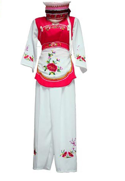 “崇尚白色”是白族人的一個(gè)明顯特點(diǎn)。不論男女都愛(ài)穿白色服飾,故有“要得俏,一身孝”之說(shuō),過(guò)去穿戴的白布又稱(chēng)“家布機(jī)”,是白族人自己種棉花,自己紡紗,自己用土機(jī)織,用土法洗漂而成,其服飾美觀大方。一般來(lái)說(shuō),男子戴五尺、七或九尺的白布頭巾。上穿白色對(duì)襟布扣汗衣,外套青色滿肩馬褂,腰系桃花兜,并配撤穗荷包,下著青色寬腳褲,腳穿白布襪子和天官云頭鞋。婦女頭上蒙白色繡花帕,兩耳垂環(huán),手戴鐲子或戒指,外套繡花圍裙,用繡花飄帶系著,右上胸佩掛三吊或五吊銀質(zhì)牙簽。下著蘭色寬褲,腳纏白色裹腳布,穿繡花尖尖鞋。無(wú)婚女性則挽“簪巴”,挽于腦后的稱(chēng)“粑粑”,挽于頭頂?shù)姆Q(chēng)高把簪,簪上套有網(wǎng),橫插簪子;兒童衣服多繡花,外圍肚兜,頭戴虎頭鼓針菩薩帽,頸戴“項(xiàng)圈”、“百家鎖”等,手腕套有銀圈,上系小吊,吊上有錘、鈴、鞋、斧、簽等。