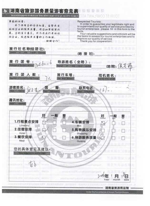 1月份,長(zhǎng)沙張女士一行7位貴賓與湖南西部(張家界)中國(guó)國(guó)際旅行社工作人員——張群取得聯(lián)系,經(jīng)過商談,雙方達(dá)成協(xié)議并簽訂旅游合同,于1月16日抵達(dá)張家界,開始張家界之旅。此次行程是由我社優(yōu)秀導(dǎo)游——侯芳菲負(fù)責(zé)旅游接待工作,侯在旅游過程中講解詳細(xì),客人也很滿意。同時(shí)也感謝張女士一行貴賓選擇湖南西部(張家界)中國(guó)國(guó)際旅行社,以及您對(duì)湖南西部國(guó)旅的信任與支持。我們會(huì)繼續(xù)努力,做好旅游接待工作。期待下一次與您的合作,祝您愉快!