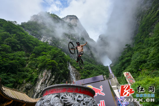 999級臺階進行適應場地訓練。選手們在空中做出各種翻滾特技動作,引來游人尖叫不斷。